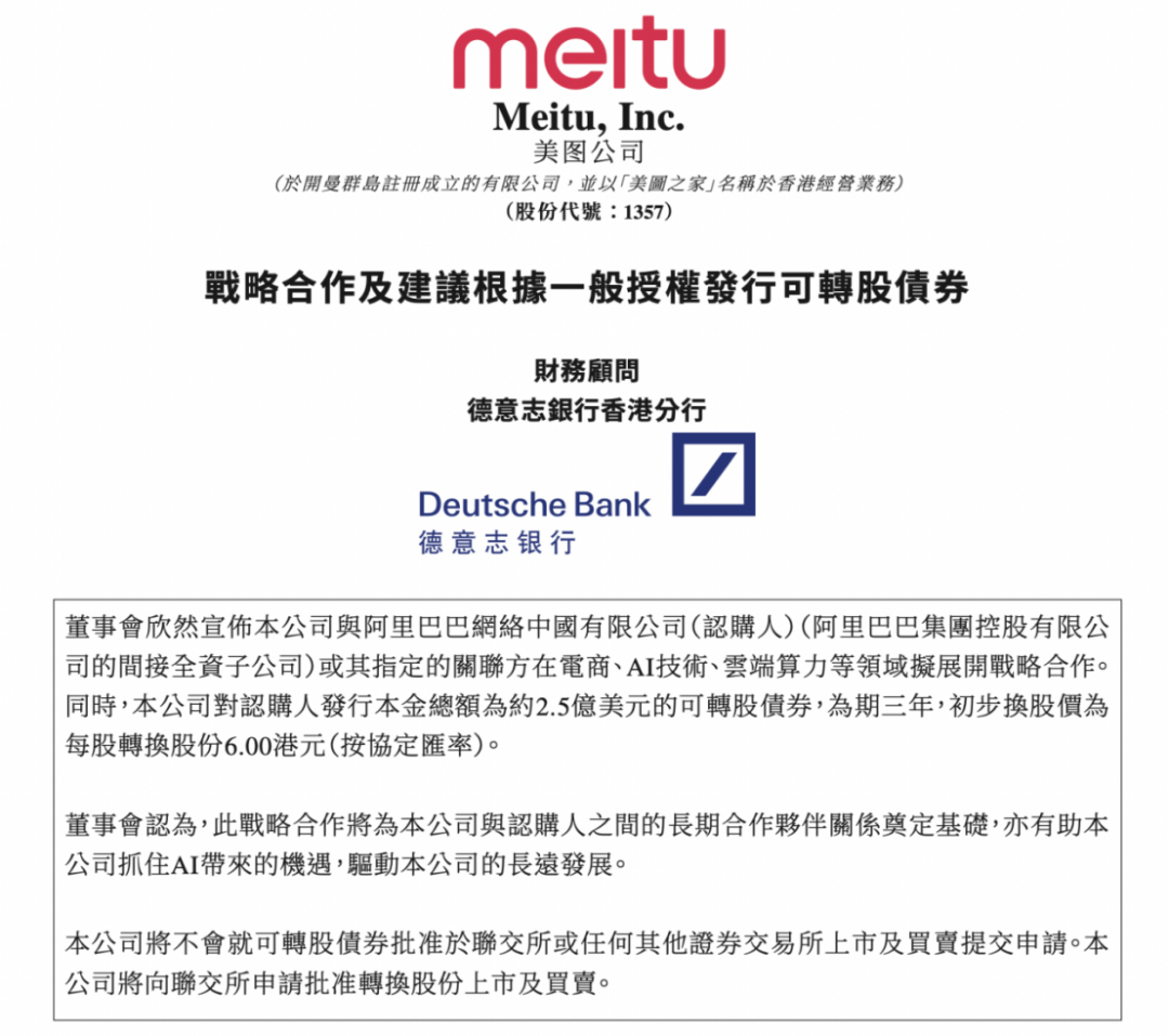 在資本層面,阿里以1%的超低年息認(rèn)購可轉(zhuǎn)債,轉(zhuǎn)股價6港元較美圖年初均價溢價24%。這種設(shè)計既為美圖提供低成本資金,又讓阿里獲得潛在6.85%股權(quán)及董事提名權(quán),轉(zhuǎn)股完成后將成為美圖重要股東。