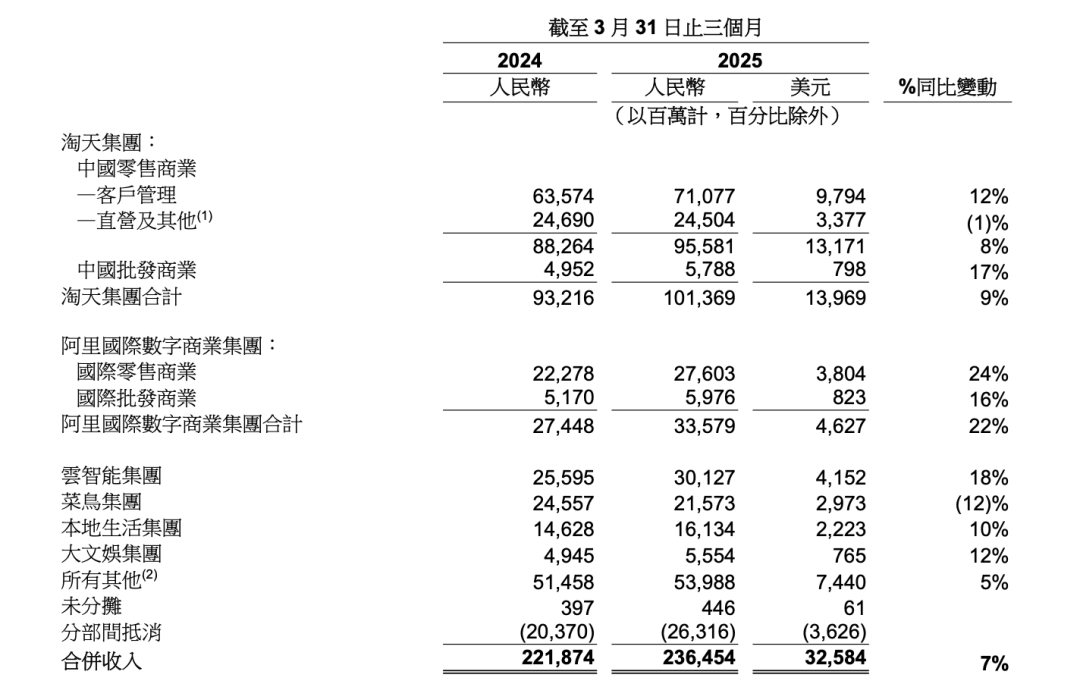 財報顯示,截至2025年3月31日止季度,淘天集團營收1013.69億元,同比增長9%,客戶管理收入同比增長12%至人民幣710.77億元。