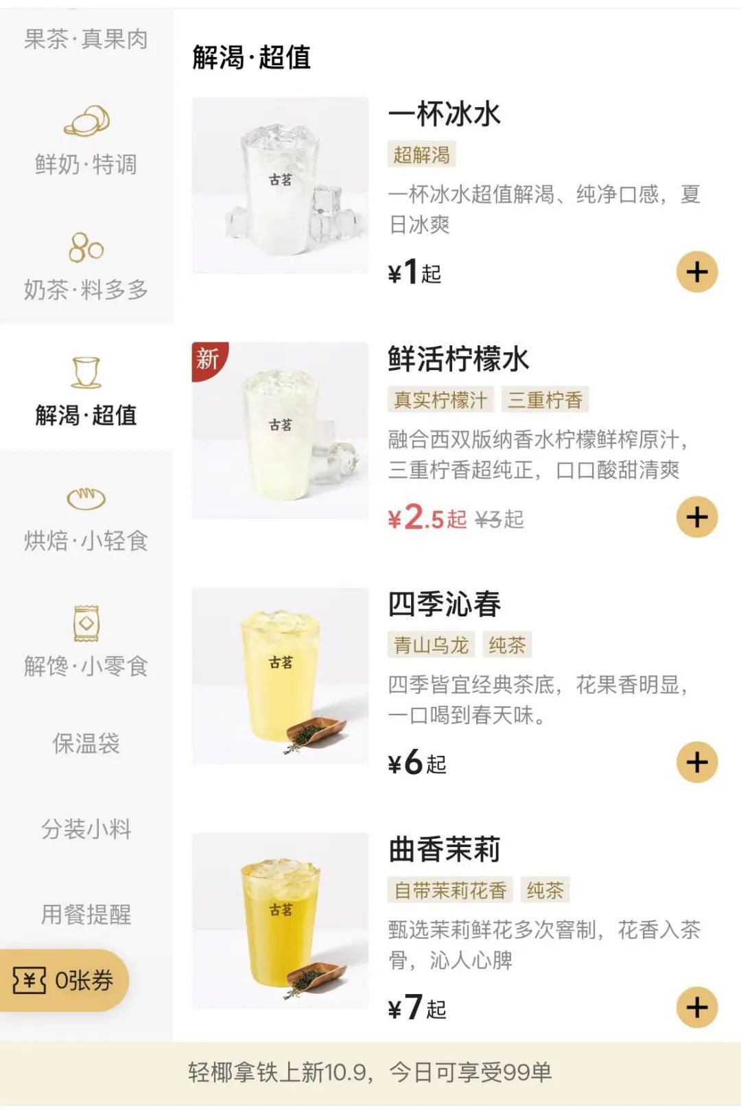 近一個月來,古茗接連上線了定價1元的“一杯冰水”、2.5元的“鮮活檸檬水”與7.9元的“早安鮮牛奶”產(chǎn)品!耙槐钡娜萘吭500毫升,價格接近甚至低于目前市面上的550毫升瓶裝飲用水。而標價2.5元、容量500毫升的“鮮活檸檬水”,價格則低于“雪王”蜜雪冰城定價5元的經(jīng)典檸檬水產(chǎn)品。