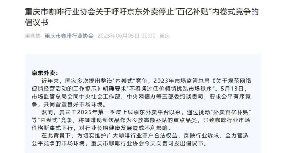 就在昨天,重慶咖啡行業(yè)協(xié)會(以下簡稱重咖協(xié))發(fā)布倡議書,公開喊話帶頭補貼的京東外賣。