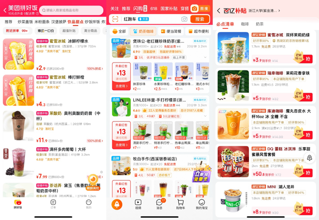 從左至右分別為美團拼好飯、餓了么x閃購、京東外賣