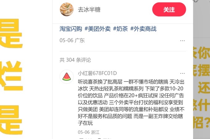 而這一點,在奈雪的改名和喜茶的漲價中產(chǎn)生了非常具體的影響:喜茶漲價后,以前長期購買喜茶且價格敏感的粉絲反應激烈,更有不少人在社交平臺直言:“學生黨以前每周喝3次喜茶,現(xiàn)在漲價后只能每月喝1次”、“23元一杯的芭樂茶,和古茗15元的差不多,為什么不選便宜的?”。