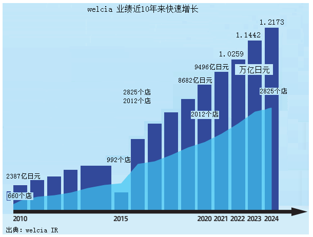 按照2024年的業(yè)績,行業(yè)老大Welcia的店鋪有3001個,銷售額為1.2850萬億日元(約合人民幣640.1億元),第二位的鶴羽的店鋪數(shù)有2658個,銷售額為1.0274萬億日元(約合人民幣511.74億元),兩家銷售額都超過1萬億日元(約合人民幣498.07億元),合并后國內(nèi)部分店鋪數(shù)量為5659個店鋪,業(yè)績?yōu)?.3124萬億日元(約合人民幣1151.76億元),從業(yè)人數(shù)達到116343人,在占行業(yè)業(yè)績8成的前10個企業(yè)的業(yè)績中占比25.04%,成為藥妝店行業(yè)最大集團,預計到2032年2月,整合銷售業(yè)績實現(xiàn)3萬億日元(約合人民幣1494.18億元)目標。