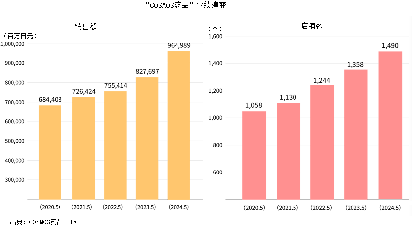 另一個有影響力的品牌是COSMOS藥品,擁有可與食品超市相媲美的食品經(jīng)營力。該公司通過低成本銷售食品迅速提高其增長力。與Welcia和鶴羽通過廣泛的M&A建立現(xiàn)有業(yè)務增長機制不同,它主要依靠自身強大的產(chǎn)品創(chuàng)新能力實現(xiàn)內(nèi)生式增長,2025年5月實現(xiàn)銷售額1.037萬億日元(約合人民幣516.51億元),同比增長7.5%,營業(yè)利潤為316億日元(約合人民幣15.73億元),同比增長0.3%,實現(xiàn)增收增益目標。