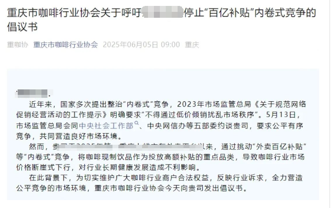 6月5日,重慶市咖啡行業(yè)協(xié)會刊發(fā)了一份本地多家獨立咖啡品牌聯(lián)名簽署的倡議書,呼吁停止“內(nèi)卷式競爭”。
