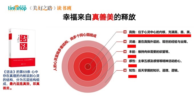 幸福來自真善美的釋放。人的內(nèi)心分五層結(jié)構(gòu),這個圖對我觸動也非常大。從真我到靈魂,到本能,到感性,再到知性。原來每個人都有真誠,你對自己的孩子不可能不真誠,你對自己的父母不可能不真誠,這么寶貴的品格多好?那就讓它釋放出來,釋放到靈魂里面,釋放到感性里面,釋放到知性里面。最內(nèi)層是真我,即真、善、美。