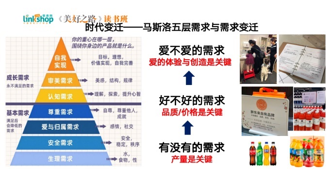 這是馬斯洛五層需求的時代變遷。在短缺經(jīng)濟(jì)時代,只要開超市,生意都很好;只要生產(chǎn)品,都相對不錯。但是那個時代已經(jīng)過去了,后來是拼“好不好”,品質(zhì)和價格是關(guān)鍵,F(xiàn)在又變遷了,愛的體驗(yàn)和創(chuàng)造是關(guān)鍵。
