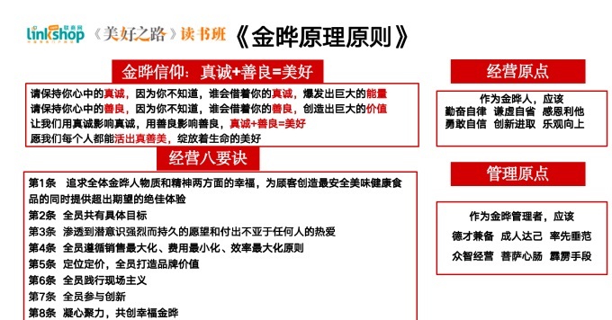 這是金曄的原理原則。金曄信仰:真誠+善良=美好。還有經(jīng)營的八要訣,經(jīng)營原點(diǎn)和管理原點(diǎn)。這些體系也都吸收了各個優(yōu)秀企業(yè)家的精髓。