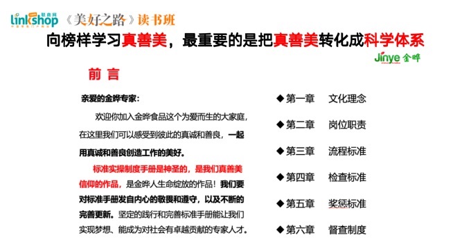 這是標(biāo)準(zhǔn)化手冊機(jī)制、獎懲標(biāo)準(zhǔn)、督查制度等等,我們把這些手冊作為神圣的信仰,是我們真善美信仰的作品,是金曄人生命綻放的作品。我們要對這個標(biāo)準(zhǔn)手冊發(fā)自內(nèi)心地敬畏和遵守,以及不斷地完善更新。