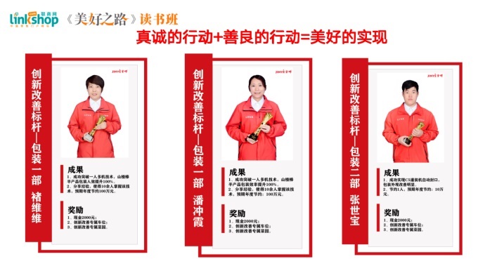 這標(biāo)準(zhǔn)體系不是領(lǐng)導(dǎo)做的,而是團(tuán)隊做的。我們通過這些標(biāo)準(zhǔn)流程綻放了我們員工的生命,像我們一線普通員工的創(chuàng)新一年也能給公司節(jié)約很多成本。比如褚維維和潘沖霞,她們的創(chuàng)新成果每年可為公司節(jié)約100萬元;張世寶的創(chuàng)新成果可為公司每年節(jié)省10萬元。車間里就掛著他們的大幅照片。這也是和德國學(xué)的,尊重每一位工人。德國的工廠車間里把工人工匠放到一個神圣的位置,也都很有尊嚴(yán),日本也是這樣。所以,金曄也是這樣做。
