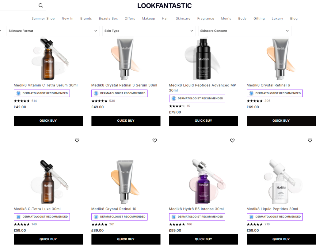 據(jù)美妝護膚在線商城LOOKFANTASTIC網(wǎng)站顯示,Medik8商品價格大致在25英鎊-89英鎊之間(約合人民幣243元-866元),為消費者提供成分導向的高端護膚方案。