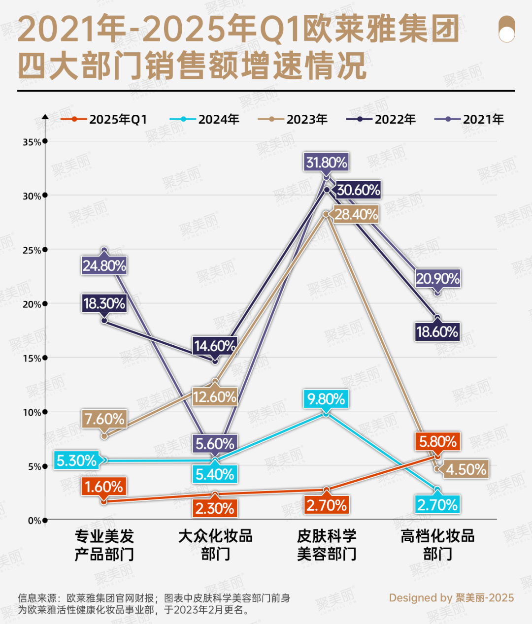 然而,2023年-2025年Q1,歐萊雅高檔化妝品部門增速僅為個位數(shù),同樣的困境還出現(xiàn)在歐萊雅專業(yè)美發(fā)產(chǎn)品部門、大眾化妝品部門。皮膚科學美容部門雖在2021-2023年間均保持近30%的增長,但自2024年起,同比同樣開始呈個位數(shù)增長。