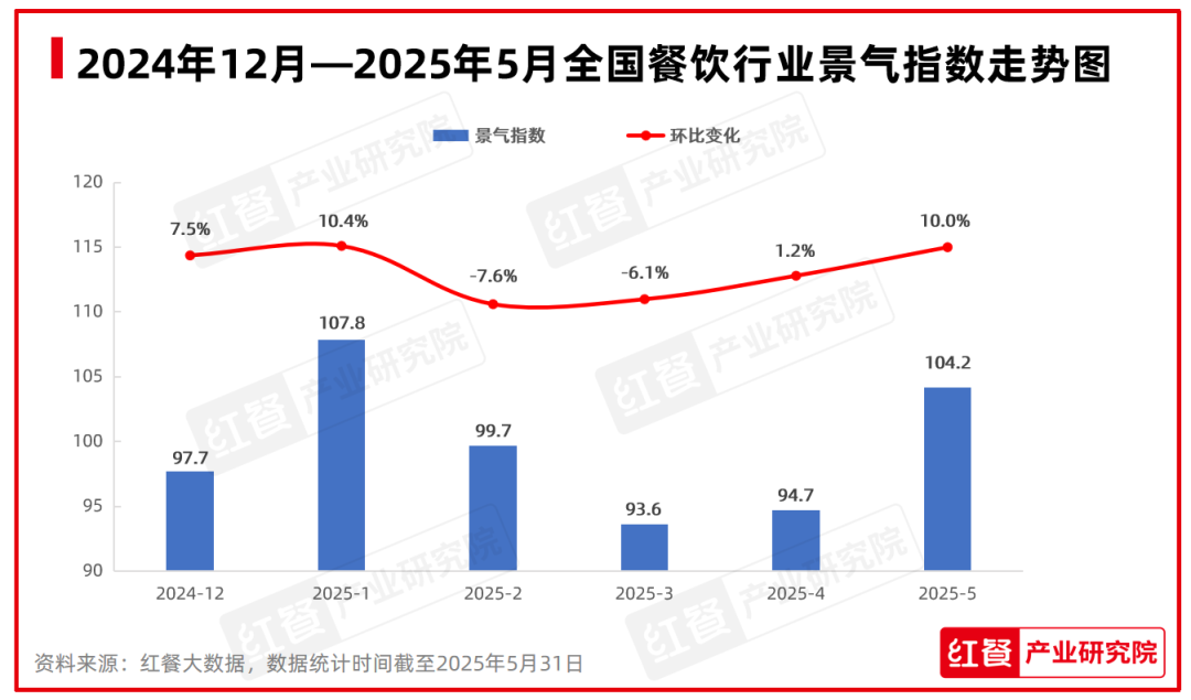 紅餐大數(shù)據(jù)顯示,2025年5月,全國(guó)餐飲行業(yè)景氣指數(shù)從4月的94.7上升至104.2,環(huán)比增長(zhǎng)10%。這一變化直觀反映出了節(jié)日經(jīng)濟(jì)對(duì)餐飲市場(chǎng)的強(qiáng)勁推動(dòng)作用,以及餐飲消費(fèi)活力的進(jìn)一步釋放。