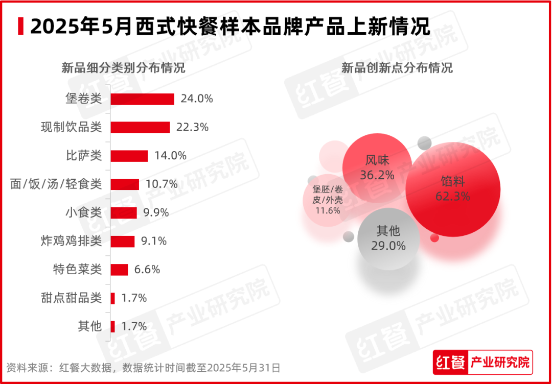 2025年5月,紅餐產(chǎn)業(yè)研究院監(jiān)測(cè)的西式快餐品牌數(shù)量為45個(gè)。其中,有25個(gè)西式快餐品牌共推出了121款新品,環(huán)比增幅達(dá)8%。