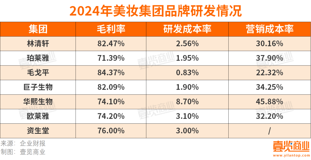 壹覽商業(yè)統(tǒng)計了7家美妝集團(tuán)毛利率、研發(fā)成本率及營銷成本率數(shù)據(jù)。從毛利率看,林清軒毛利率高于同行,在7大美妝集團(tuán)中,僅次于以彩妝見長的毛戈平。相較于彩妝,護(hù)膚品的消費決策周期更長、用戶復(fù)購更理性、對成分功效的要求也更高。