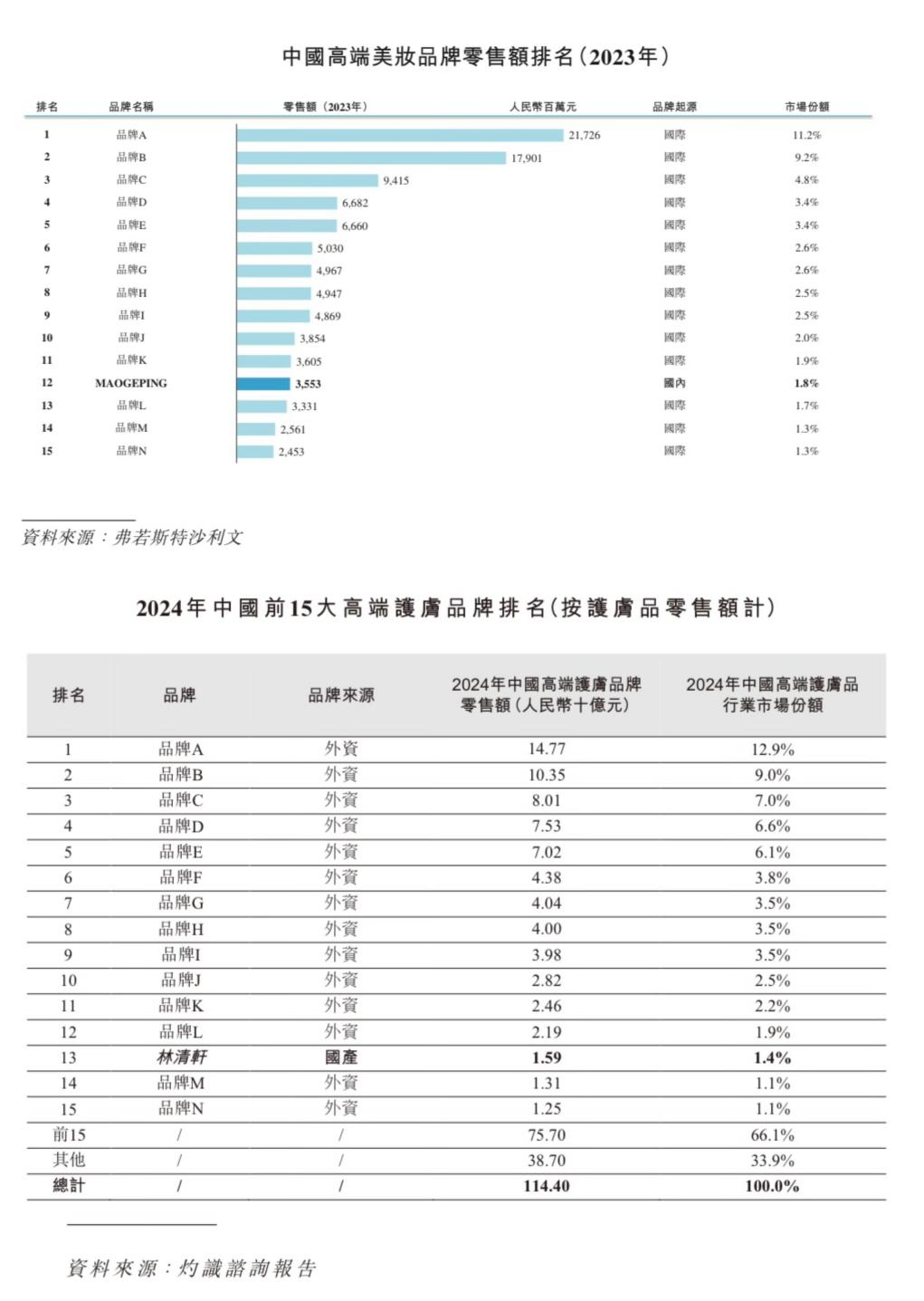 在毛戈平的招股書里,弗若斯特沙利文出具了一份2023年中國高端美妝品牌零售額排名,毛戈平排名12,成唯一上榜品牌,在林清軒的招股書里,灼識咨詢出具了一份2024年中國前15大高端護(hù)膚品品牌排名,林清軒排13,同樣是唯一上榜品牌。