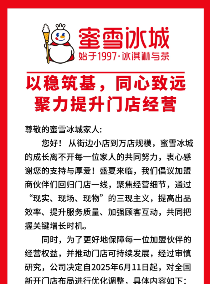 6月9日,蜜雪冰城的官方公眾號(hào)“蜜雪合作中心”發(fā)布了一則新通知,宣布自2025年6月11日起,對(duì)全國(guó)新開(kāi)門店布局進(jìn)行優(yōu)化調(diào)整。