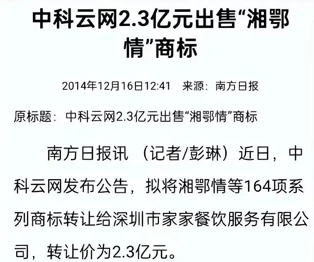 為了應(yīng)對(duì)危機(jī),孟凱無奈轉(zhuǎn)讓了包括“湘鄂情”“湘鄂緣”“荷舍”等在內(nèi)的164項(xiàng)系列商標(biāo)使用權(quán),獲得2.3億元轉(zhuǎn)讓款,其抵押的全部股權(quán)也被拍賣。