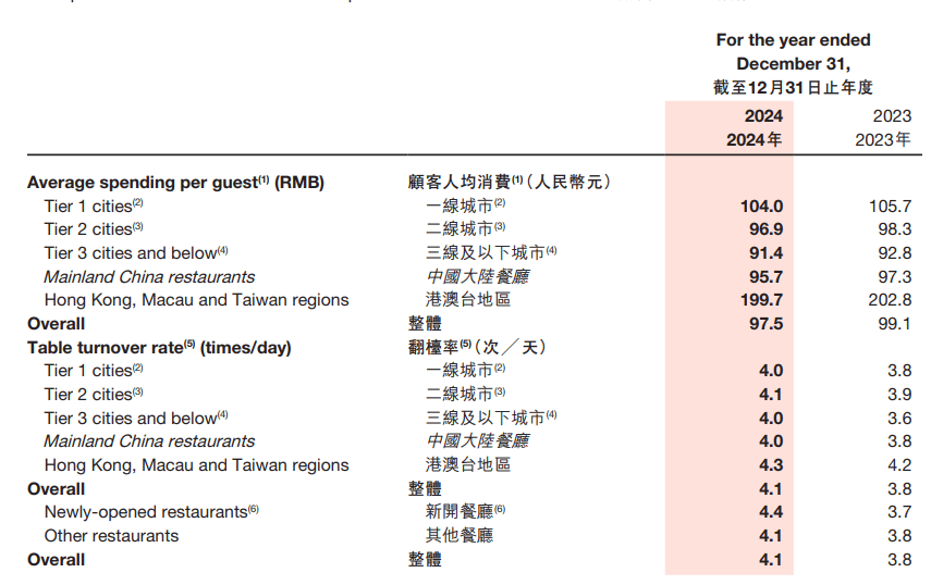 另一邊,盡管海底撈的翻臺率從2023年的3.8次/天增長到了4.1次/天,但其顧客人均消費從99.1元下降到了97.5元。人均消費降低,意味著每個消費者在海底撈花的錢變少了,這將直接影響海底撈的業(yè)績。