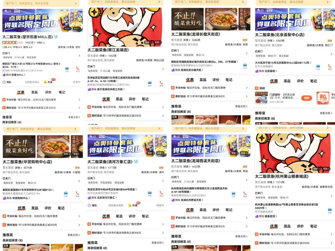 近日,內(nèi)參君在大眾點(diǎn)評(píng)搜索發(fā)現(xiàn),有6家太二酸菜魚(yú)店已關(guān)門(mén),且均為商場(chǎng)店。其中包括,龍湖長(zhǎng)楹天街、華茂購(gòu)物中心、薈聚中心、清河萬(wàn)象匯、龍湖西溪天街、望京凱德MALL等商場(chǎng)。