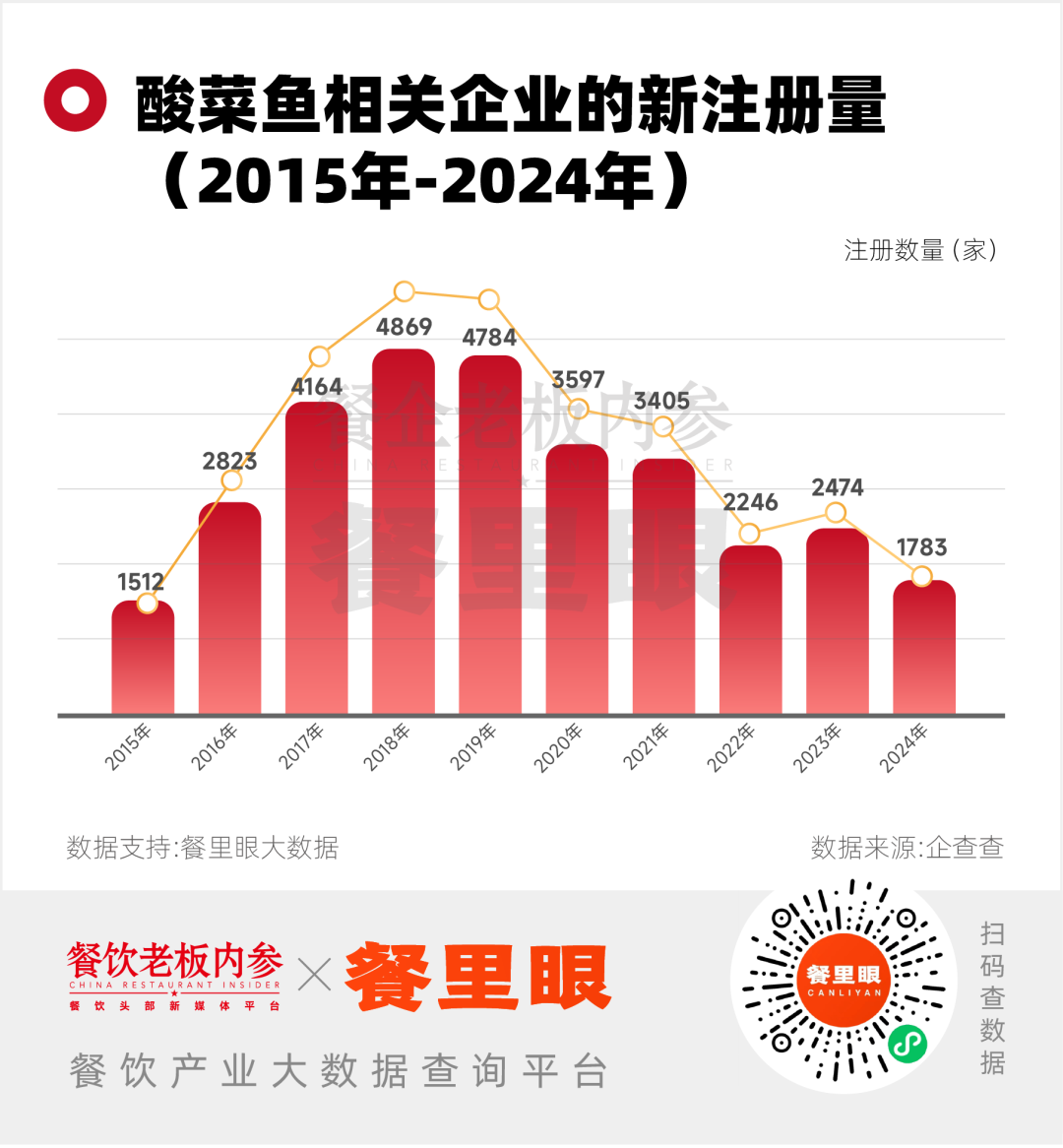2015年-2018年,酸菜魚(yú)品類(lèi)市場(chǎng)熱度持續(xù)攀升直至登頂。很快,單一產(chǎn)品的生命周期短、抗風(fēng)險(xiǎn)能力弱、高度同質(zhì)化等短板漸漸導(dǎo)致酸菜魚(yú)品類(lèi)市場(chǎng)紅利期消退,增長(zhǎng)速度放緩。企查查顯示,目前我國(guó)在業(yè)/存續(xù)的“酸菜魚(yú)”相關(guān)企業(yè)總數(shù)約1.7萬(wàn)家,注銷(xiāo)/吊銷(xiāo)的高達(dá)1.9萬(wàn)多家。