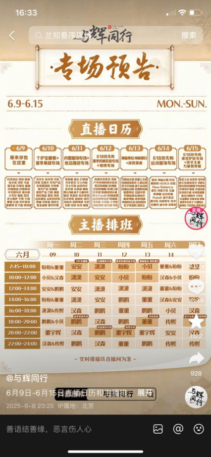 今年5月13日-6月6日,董宇輝僅參與6場直播,總時長13.5小時,平均每場約2.25小時。根據(jù)“與輝同行”給出的專場預告,6月9日~6月15日董宇輝只有三場直播,每場兩小時,延續(xù)去年就有的“不怎么積極”態(tài)度。