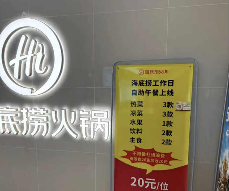 職餐記者發(fā)現(xiàn),海底撈西安一門店,在店門口支起了“上線工作日自助午餐”的廣告。