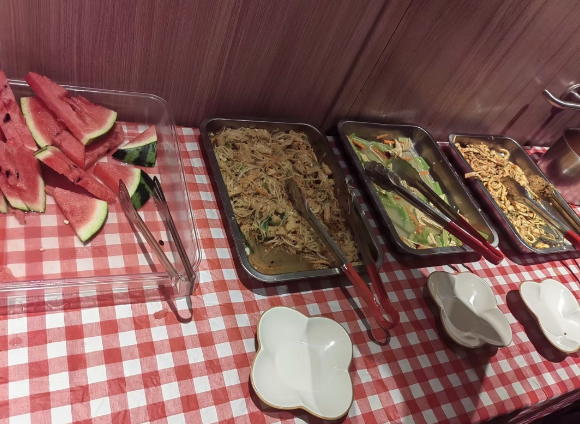 菜色包括3款熱菜,都是家常菜;3款涼菜;1款水果西瓜;2款飲料金桔檸檬和酸梅湯;2款主食。