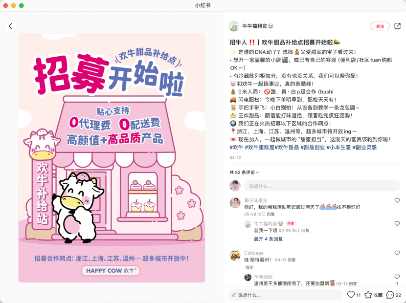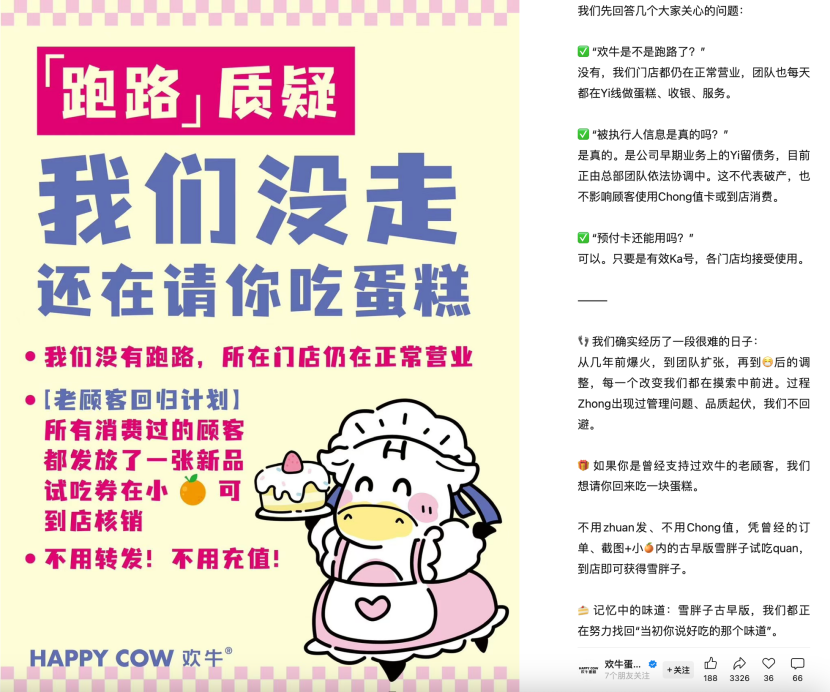 對此,歡牛蛋糕屋在6月8日發(fā)文否認(rèn)“倒閉”傳聞,稱“被執(zhí)行信息是公司早期業(yè)務(wù)的遺留問題”,門店正常運營,并針對老顧客推出試吃活動。
