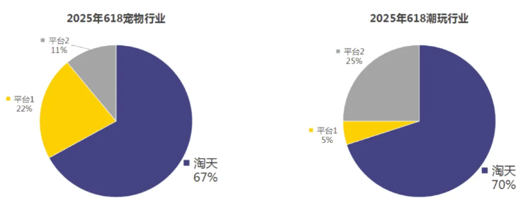 風(fēng)口之下,今年首波618大促期間(5月16日-5月26日),以寵物行業(yè)、潮玩行業(yè)為代表的情緒型新消費賽道表現(xiàn)極佳。其中,淘天占據(jù)統(tǒng)治地位,占有率分別高達67%與70%,約為業(yè)內(nèi)第二名的3倍。