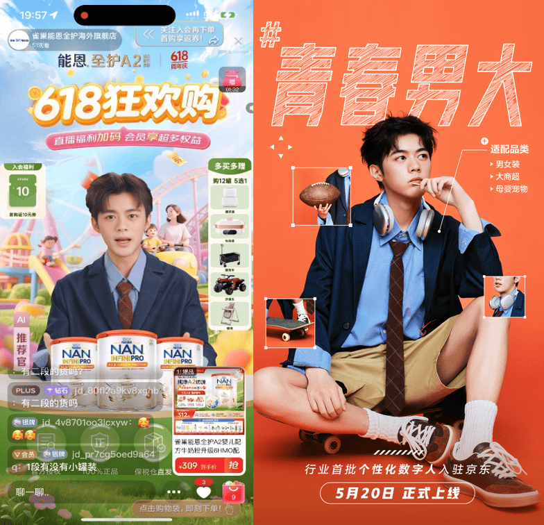 雀巢就選用了新上線的“青春男大”形象開啟直播,這是由青年演員羅殿夏的形象復(fù)刻而來。借助京東·成長加速計劃,雀巢使用最新推出的高商業(yè)可用數(shù)字人,在6月實現(xiàn)店鋪GMV環(huán)比增長39%,其中直播滲透率提升至9%,客群結(jié)構(gòu)顯著優(yōu)化——老客復(fù)購率增長36%,新客轉(zhuǎn)化率提升13%。