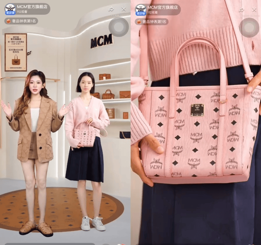 “這款桃花粉托特低調(diào)中透出高級感,下班后卸下西裝換成碎花連衣裙,子包單獨斜挎,瞬間切換甜美約會模式”,MCM直播間里,兩位主播默契配合,邊講解邊展示;