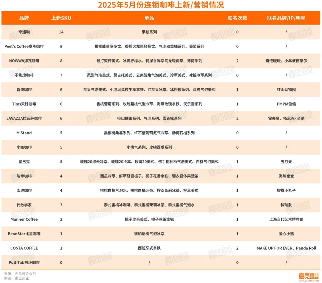 從上新情況看,27個(gè)品牌共上新約85款SKU,上新總量環(huán)比提升,較4月多出9款。其中,幸運(yùn)咖推出14款SKU,是5月上新最多的品牌;NOWWA挪瓦咖啡、Peet's Coffee皮爺咖啡緊隨其后,上新8款SKU;瑞幸、庫迪、星巴克等頭部品牌上新較少,更注重爆款打造。