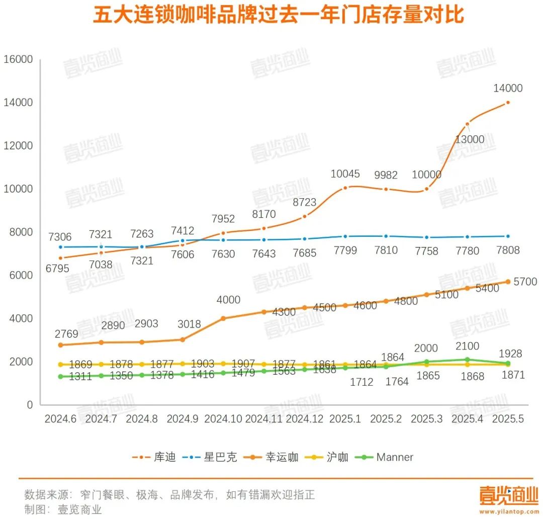 從頭部品牌的門店擴(kuò)張看,品牌分化顯著,頭部本土品牌主導(dǎo)市場。瑞幸是絕對領(lǐng)導(dǎo)者,門店規(guī)模和增速均第一;庫迪咖啡增長最快,現(xiàn)存14000家門店,歷史數(shù)據(jù)顯翻倍擴(kuò)張;后起之秀幸運(yùn)咖增長迅猛,一年門店存量翻倍,按此速度發(fā)展下去,門店數(shù)量或?qū)⒃诿髂瓿叫前涂恕?/p>