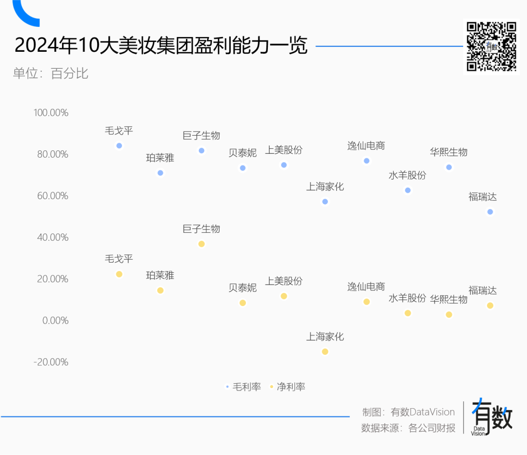 依靠線下渠道高達(dá)86%的毛利,毛戈平整體毛利率高達(dá)84.4%。不僅吊打歐萊雅和巨子生物,碾壓醫(yī)美連鎖店美麗田園,離根正苗紅的“醫(yī)美茅”愛美客也只差10%。