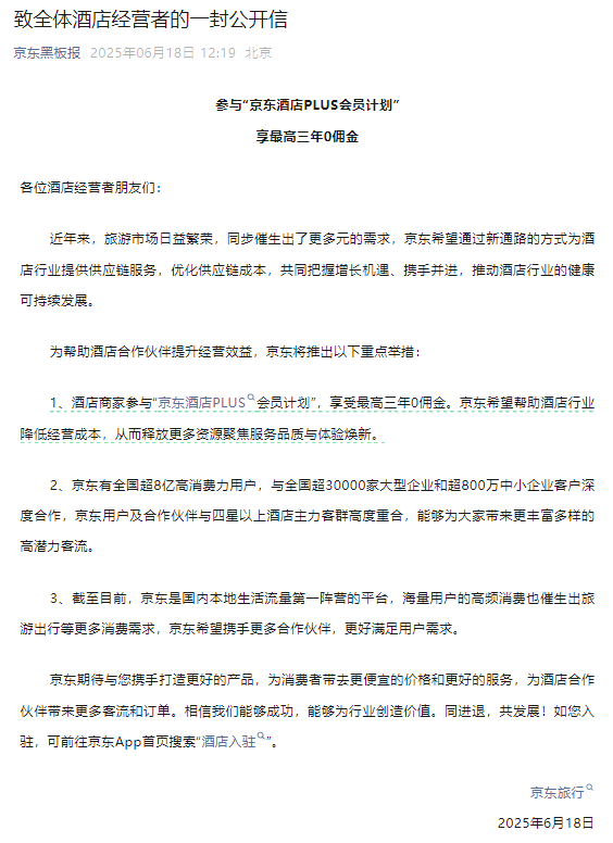 6月18日,“京東黑板報”發(fā)布《致全體酒店經(jīng)營者的一封公開信》,宣布京東正式入局酒旅市場。