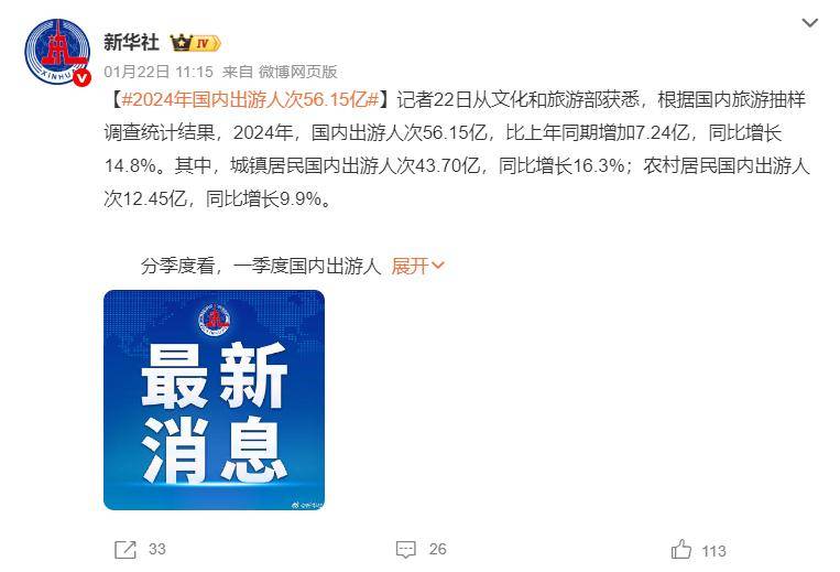 另一邊,國內(nèi)旅游行業(yè)則迎來了亮眼的復(fù)蘇。據(jù)文化和旅游部統(tǒng)計,2024年,全國全年旅游人次達到56.15億,同比增長14.8%,總收入高達5.75萬億元,增長17.1%。