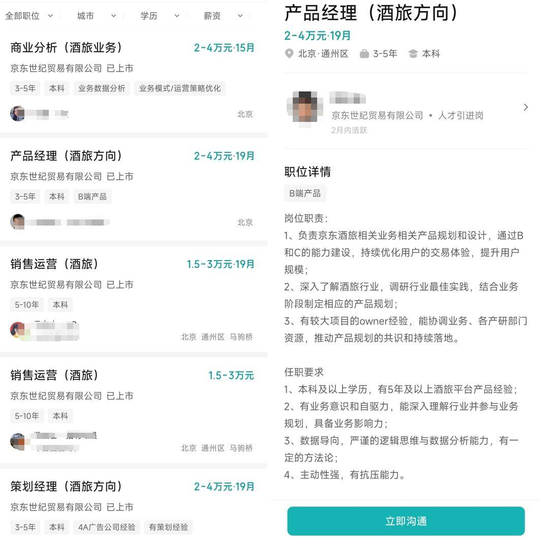 例如,京東近期發(fā)布的“產(chǎn)品經(jīng)理-酒旅方向”招聘信息顯示,薪資為20-40k·19月,崗位職責包括“負責酒旅相關(guān)產(chǎn)品規(guī)劃和設(shè)計”“結(jié)合業(yè)務(wù)階段制定相應(yīng)產(chǎn)品規(guī)劃”等,崗位要求“有5年及以上酒旅平臺工作經(jīng)驗”等。