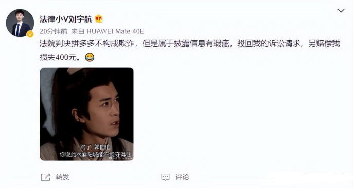 這些套路引發(fā)了大量用戶的不滿,相關(guān)投訴和吐槽在網(wǎng)絡(luò)上此起彼伏。甚至有用戶將拼多多告上法庭,認(rèn)為其“砍一刀”活動(dòng)存在虛假宣傳、欺詐消費(fèi)者等問題。其中,上海律師劉宇航起訴拼多多“砍一刀”涉嫌欺詐一案備受關(guān)注,雖然最終法院認(rèn)定拼多多不構(gòu)成欺詐,但存在知情權(quán)侵害,需向原告賠償損失400元。