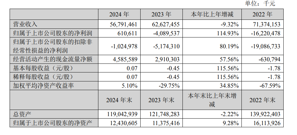 從蘇寧易購(gòu)的財(cái)務(wù)報(bào)表來(lái)看,盡管在2024年實(shí)現(xiàn)營(yíng)收567.91億元,同比下滑9.32%;歸母凈利潤(rùn)6.1億元,實(shí)現(xiàn)扭虧為盈,同比增長(zhǎng)114.93%,自2020年以來(lái)首次實(shí)現(xiàn)全年盈利 ,且經(jīng)營(yíng)活動(dòng)產(chǎn)生的現(xiàn)金流量?jī)纛~45.86億元,同比增長(zhǎng)57.56%。