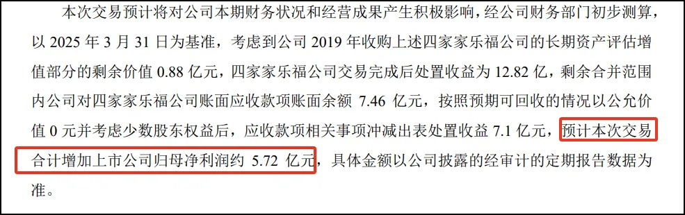 從財(cái)務(wù)數(shù)據(jù)測(cè)算來(lái)看,以2025年3月31日為基準(zhǔn),考慮到公司2019年收購(gòu)上述四家家樂(lè)福公司的長(zhǎng)期資產(chǎn)評(píng)估增值部分的剩余價(jià)值0.88億元,四家家樂(lè)福公司交易完成后處置收益為12.82億元,剩余合并范圍內(nèi)公司對(duì)四家家樂(lè)福公司賬面應(yīng)收款項(xiàng)賬面余額7.46億元,按照預(yù)期可回收的情況以公允價(jià)值0元并考慮少數(shù)股東權(quán)益后,應(yīng)收款項(xiàng)相關(guān)事項(xiàng)沖減出表處置收益7.1億元,預(yù)計(jì)本次交易合計(jì)增加上市公司歸母凈利潤(rùn)約5.72億元。