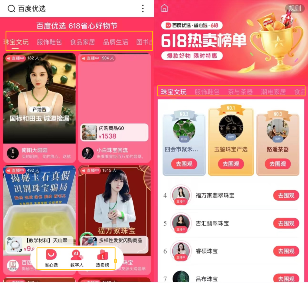 第二就是打開百度商城,并沒有商品搜索功能,這是非常重要的。在主界面只有一排“珠寶文玩、服飾鞋包”的分類勉強(qiáng)可供選擇商品,還有“省心選、數(shù)字人、熱賣榜”3個(gè)可交互的圖標(biāo)。