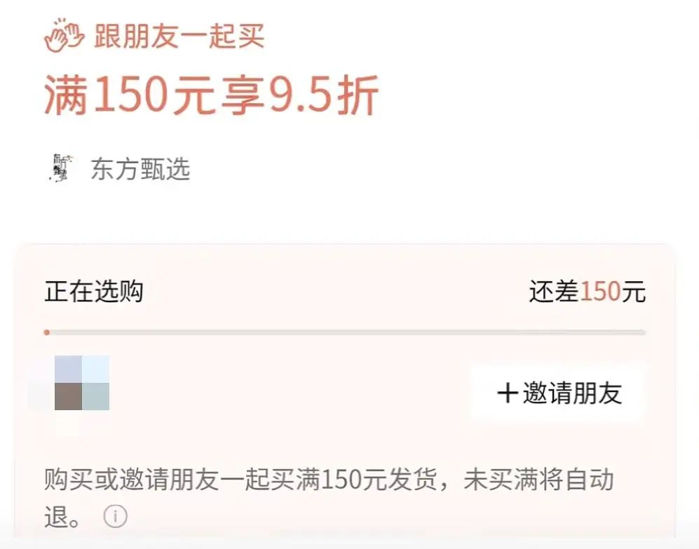 “一起買”功能類似于拼多多的拼團功能,但僅有金額要求,并沒有人數要求。用戶發(fā)起拼單后,只需邀請好友湊滿指定金額即可成團,如果拼團超時未達到目標金額,系統(tǒng)則會自動退款。