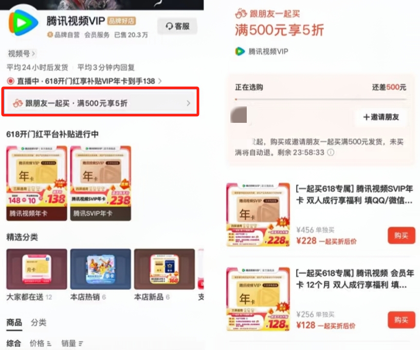 點擊進入九牧王、良品鋪子、東方甄選和騰訊視頻等品牌的微信小店,會在店鋪首頁發(fā)現一行小字,“跟朋友一起買,滿XXX元享受XX折”,點擊后跳出選購頁面,用戶可以通過“邀請朋友”選項,將拼單鏈接發(fā)送給朋友,邀請朋友一同下單購買。