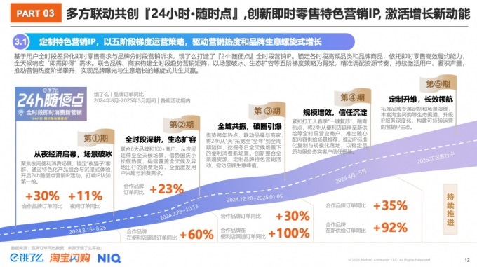 從全時(shí)段覆蓋,到季節(jié)性全周期運(yùn)營(yíng),從節(jié)慶爆發(fā)式增長(zhǎng)到日常需求的精準(zhǔn)挖掘……過(guò)去一年,「24小時(shí)?隨便點(diǎn)」IP錨定各時(shí)段高頻品類和品牌商品,聯(lián)合品牌、商家構(gòu)建全時(shí)段趨勢(shì)營(yíng)銷矩陣,不斷創(chuàng)新場(chǎng)景,拓展倉(cāng)店等新全天候渠道,持續(xù)激活消費(fèi)者需求,幫助合作品牌高頻實(shí)現(xiàn)品牌曝光與生意的螺旋式上升。對(duì)快消品牌來(lái)說(shuō),餓了么正在成為品牌創(chuàng)新的策略源發(fā)地:創(chuàng)新商品組合打破品類邊界,跨界玩法重構(gòu)消費(fèi)體驗(yàn),定制聯(lián)名周邊激發(fā)社交裂變……IP營(yíng)銷本身正在從單次流量爆發(fā)升級(jí)為長(zhǎng)效價(jià)值創(chuàng)造的引擎。