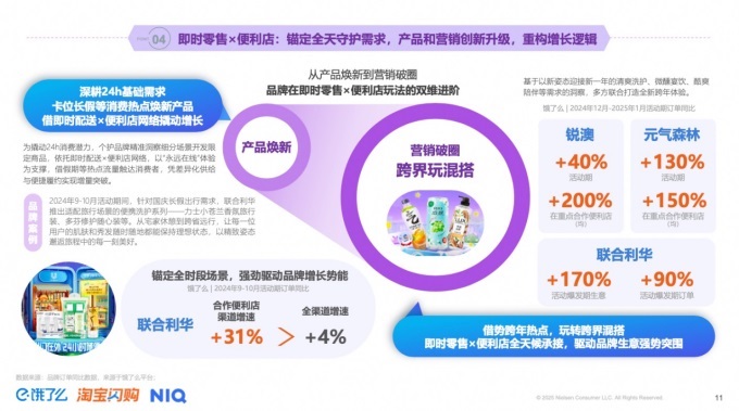 當(dāng)以餓了么為代表的即時(shí)零售平臺(tái)為快消品們打開24小時(shí)全時(shí)段的生意場(chǎng)景,品牌們?nèi)绾握嬲プ〖?xì)分場(chǎng)景的需求和增長(zhǎng)機(jī)遇?即時(shí)零售的旺季夏季已至,近日,餓了么和尼爾森IQ聯(lián)合推出《2025即時(shí)零售全時(shí)段消費(fèi)場(chǎng)景新趨勢(shì)》。報(bào)告深度剖析近一年全時(shí)段消費(fèi)新趨勢(shì)、新場(chǎng)景、新需求,通過(guò)詳實(shí)的數(shù)據(jù)洞察與鮮活的案例解讀,為行業(yè)從業(yè)者提供策略參考,助力快消品企業(yè)在新賽道上持續(xù)領(lǐng)跑。