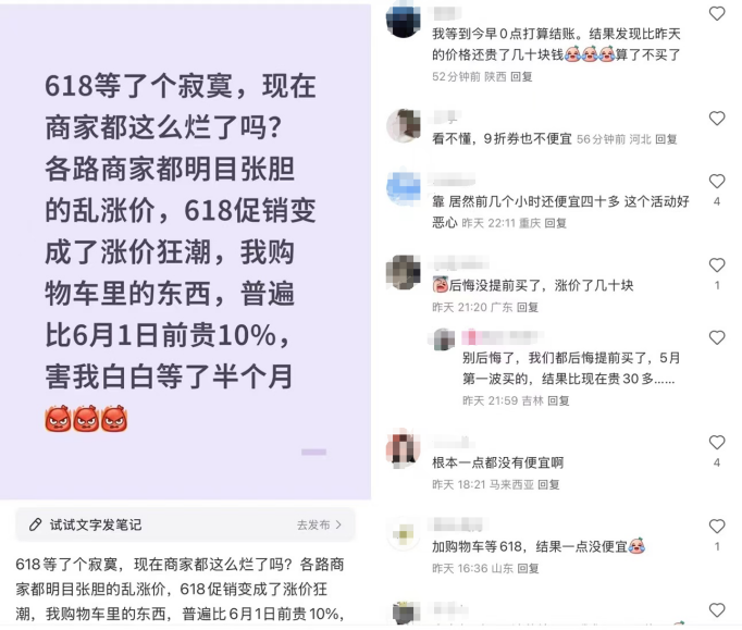 6月18日,活動(dòng)大促已接近尾聲,許多聽信“第三波最便宜”的用戶等到618當(dāng)天,才發(fā)現(xiàn)根本一點(diǎn)都沒便宜,還漲了幾十塊。