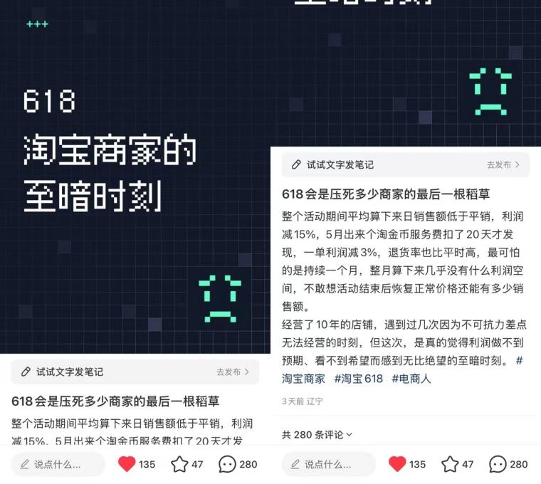 更有商家表示,618是淘寶商家的“至暗時(shí)刻”!罢麄(gè)活動(dòng)日銷售額低于平消,利潤減15%”,他說整個(gè)月算下來幾乎沒有什么利潤空間,退貨率也比平時(shí)高。