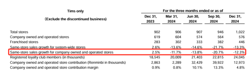 進(jìn)一步分析其總收入情況可知,自營(yíng)門店的業(yè)績(jī)對(duì)其影響顯著。具體來(lái)看,今年一季度,Tims自營(yíng)門店?duì)I收為2.55億元,較2024年同期的2.96億元下降14%。