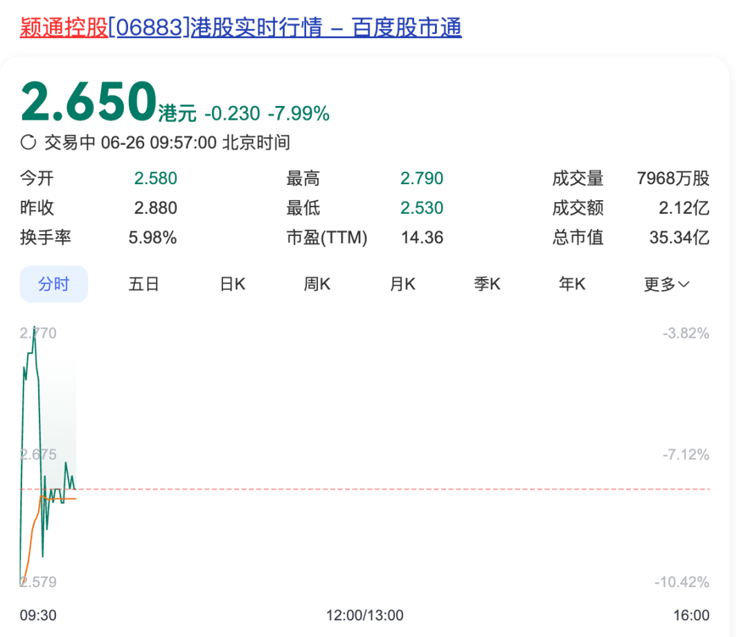 6月26日,穎通控股有限公司(簡(jiǎn)稱“穎通控股”)在港交所上市,每股發(fā)行價(jià)為2.88港元,早盤低開10.42%至2.58港元/股;截至發(fā)稿,每股跌7.99%至2.65港元,總市值35.34億。